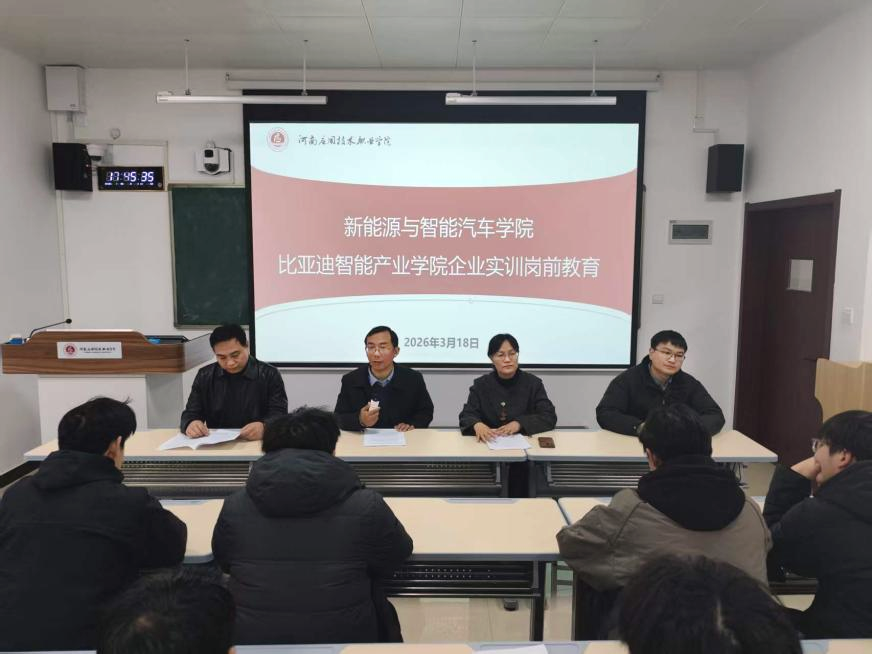 3月18日,新能源与智能汽车学院在B205举行比亚迪智能产业学院企业实训岗前教育会,为即将于3月19日奔赴比亚迪郑州工厂开展企业实训的55名大二学生进行岗前专题教育。学院党总支书记付永、院长孙丽娜、副院长仵征、学工办主任董芳甫及全体大二辅导员出席会议。