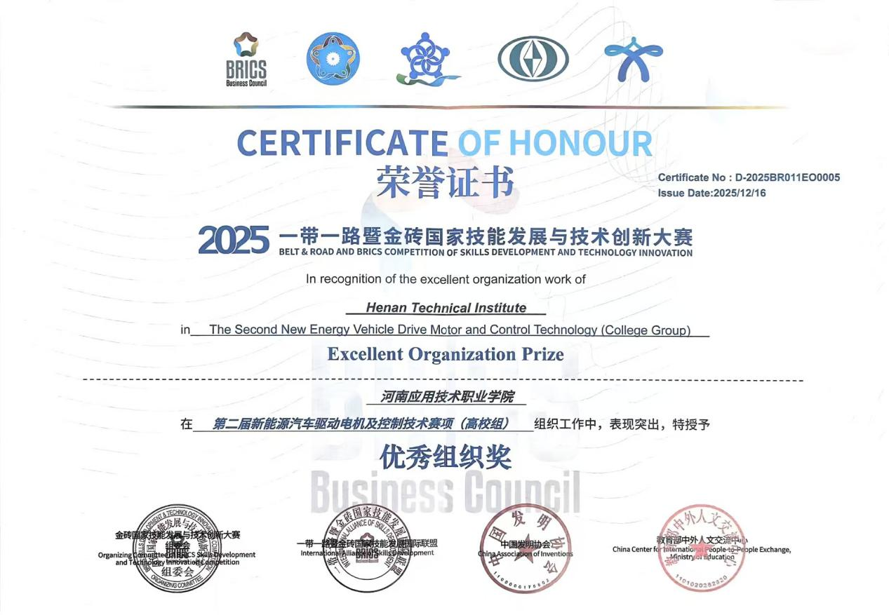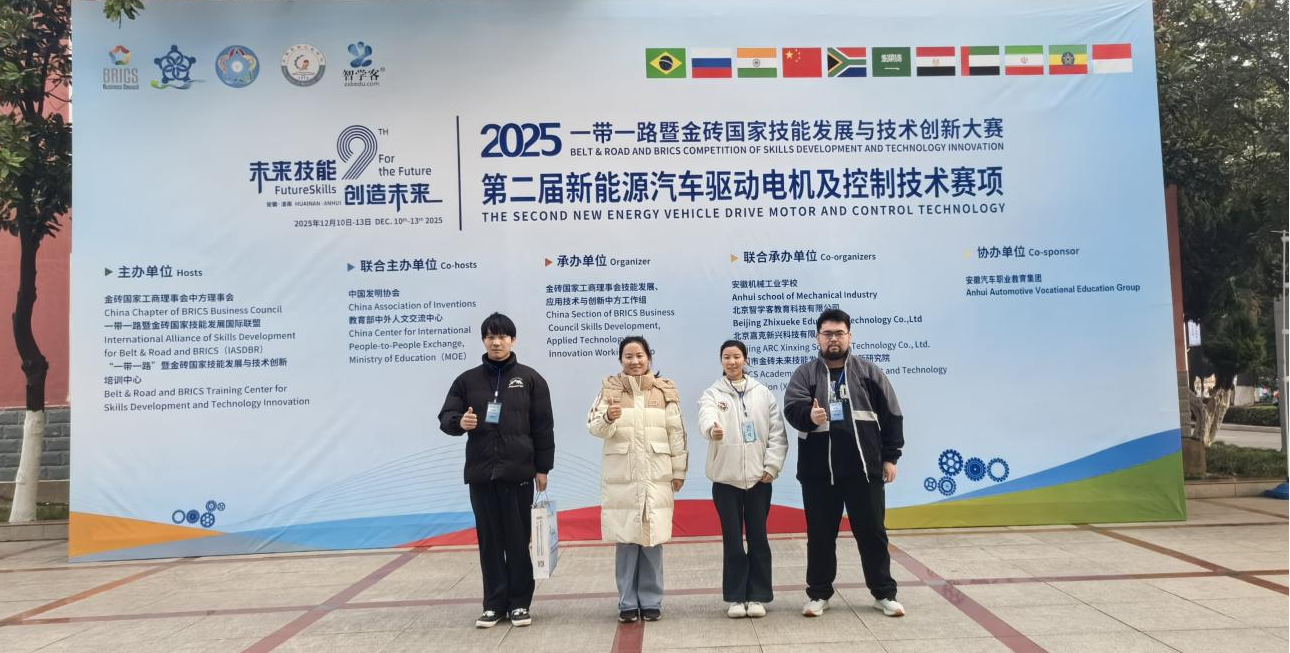 2025年12月11日-13日在安徽举办的2025年一带一路暨金砖国家技能发展与技术创新大赛—第二届新能源汽车驱动电机及控制技术赛项决赛中,我校新能源与智能汽车学院师生团队凭借精湛技艺与稳定发挥,从全国266支强劲队伍中脱颖而出,荣获国赛二等奖、三等奖各一项,学校同时获评“优秀组织奖”。该赛事作为深化“一带一路”与金砖国家间技能发展与创新合作的重要平台,对推动新能源汽车领域国际技术交流、标准化人才培养具有深远意义。